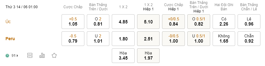 Tỉ lệ kèo Australia vs Peru