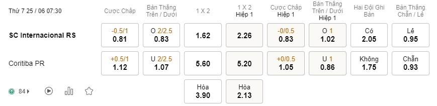 Tỉ lệ kèo Internacional vs Coritiba